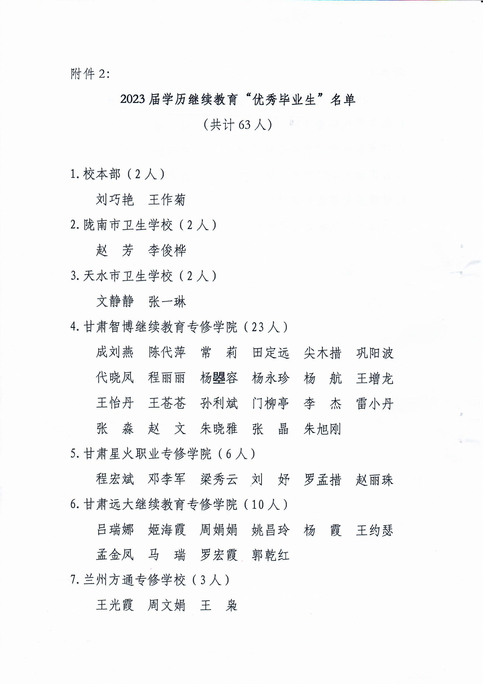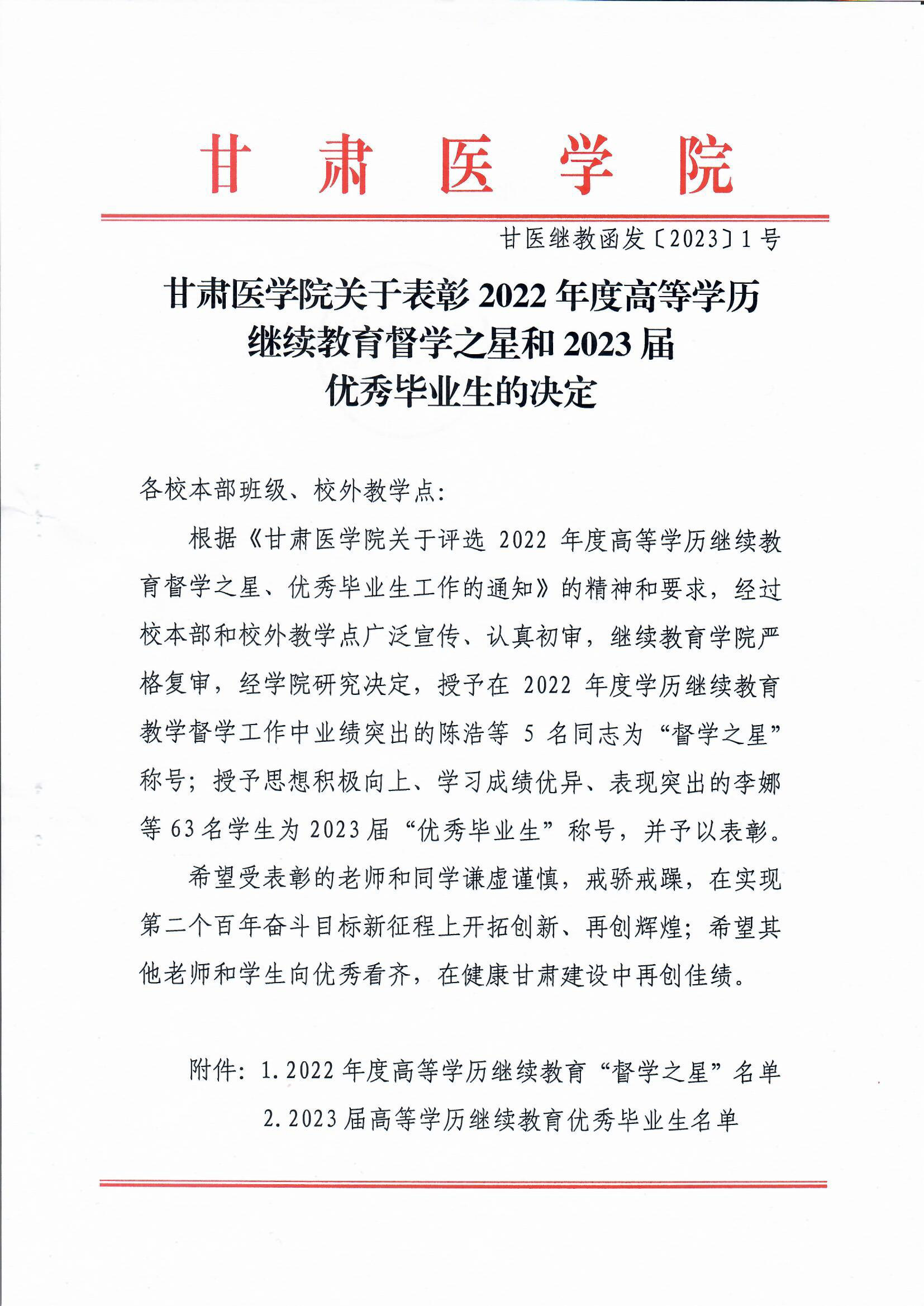 甘肃医学院关于表彰2022年度高等学历继续教育督学之星和2023届优秀毕业生的决定